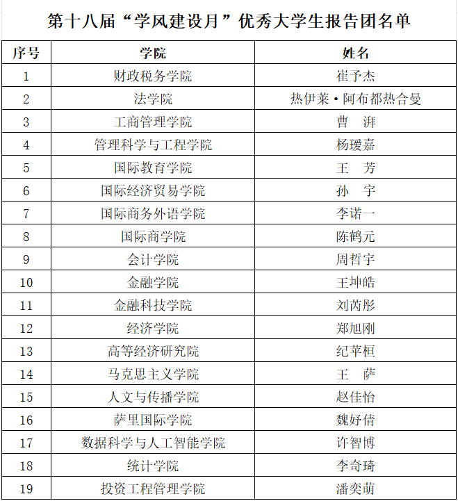 报告会上,来自各学院的19位报告团成员结合自身学习成长经历,从立德修身、学业钻研、创新创业、社会实践、美育提升、体育竞赛等方面分享经验与感悟。成员们深耕专业学习、夯实学业基础,投身科研实践、服务社会发展,积极参与学科竞赛、勇于突破自我,热心志愿服务、主动担当奉献,坚持全面发展、提升综合素养,以真实经历展现新时代东财学子的精神风貌与责任担当。