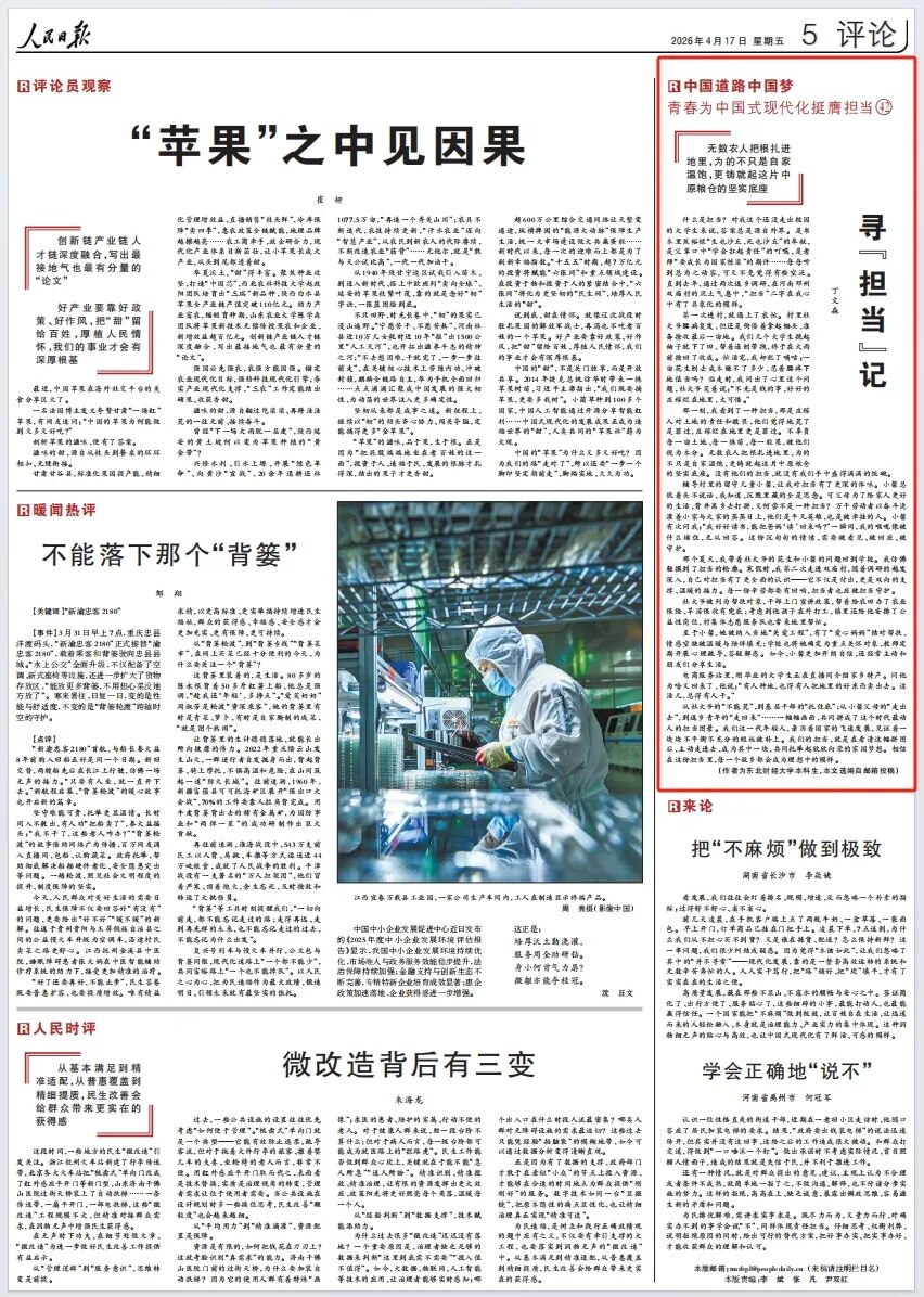 2026年4月17日,《人民日报》05版“中国道路中国梦 青春为中国式现代化挺膺担当”栏目以《寻 “担当” 记》 为题,刊发了东北财经大学萨里国际学院2023级学生丁文淼的青春感悟,让青年之声登上国家级媒体平台,让担当精神在新时代闪闪发光。