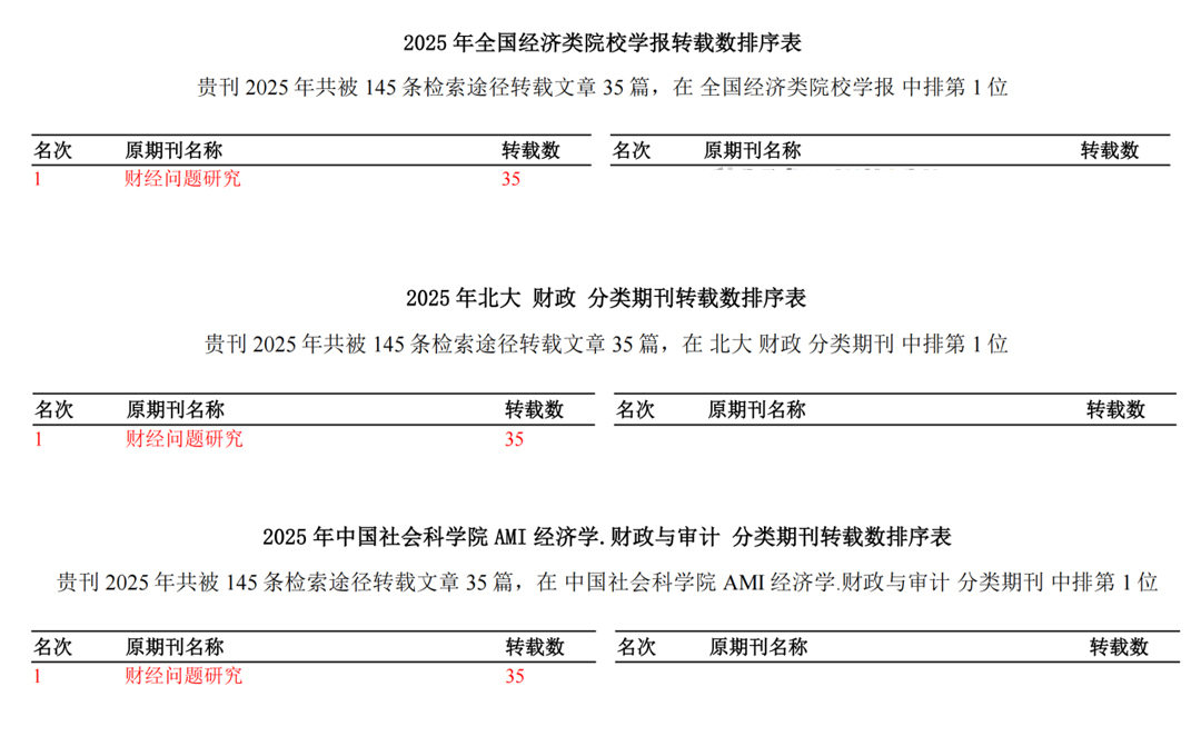 《财经问题研究》在聚焦“理论研究”“经济观察”两大品牌栏目的基础上,紧密围绕中央经济工作会议精神,策划了“学习贯彻中央经济工作会议精神”等专题。2025年,《财经问题研究》被转载文章数量在“全国经济类院校学报”中排第1位,在“北大财政分类期刊”中排第1位,在“中国社会科学院 AMI 经济学·财政与审计分类期刊”中排第1位。全年刊发文章转载转摘率高达31.53%。