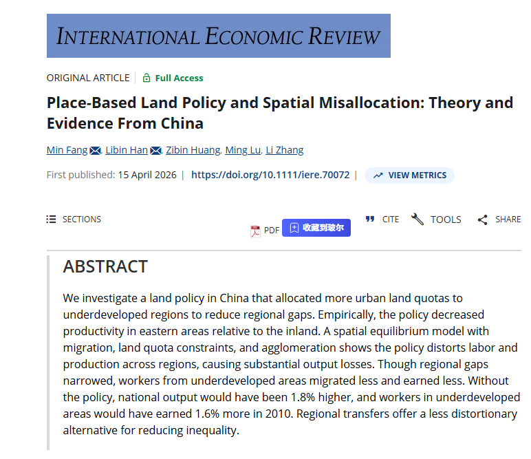 东北财经大学东北全面振兴研究院韩立彬副研究员的论文“Place-based Land Policy and Spatial Misallocation: Theory and Evidence from China”被国际顶级期刊International Economic Review 接收发表,该论文合作者为中欧国际工商学院方敏助理教授、上海财经大学黄子彬副教授、上海交通大学陆铭教授、中山大学张莉教授。